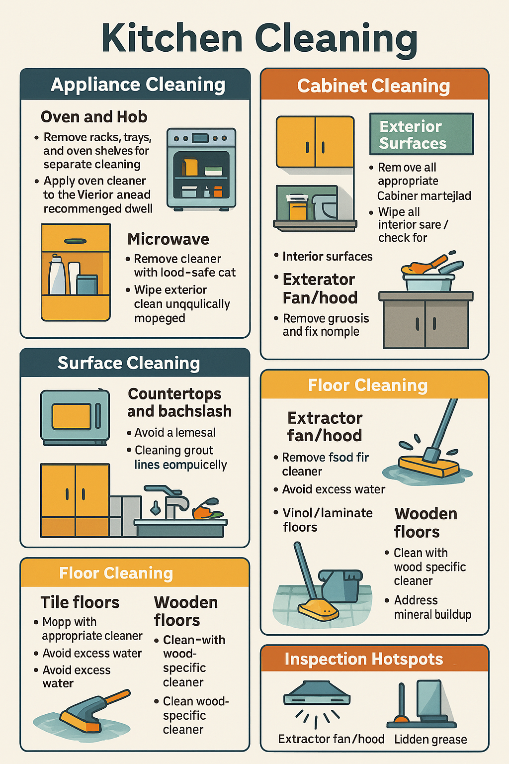 - Address grease buildup, especially on cabinets near the stove