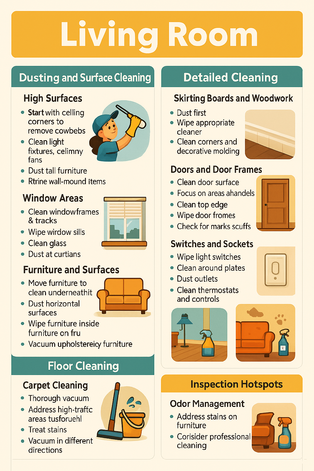- Wipe top edges of doors (often missed but checked by inspectors)
