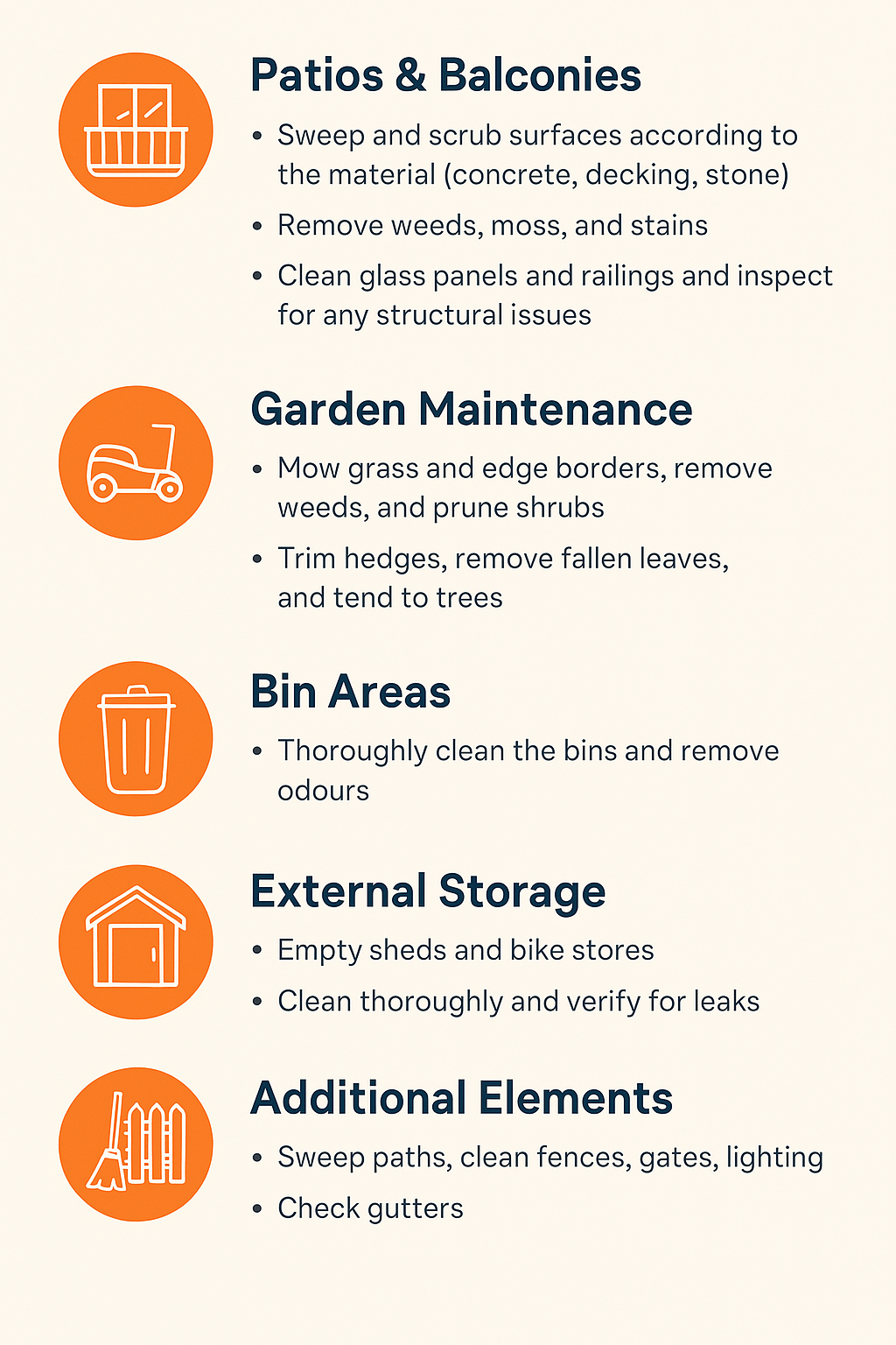 - Outside Areas: 1 hour (Garden, patio, bin storage)