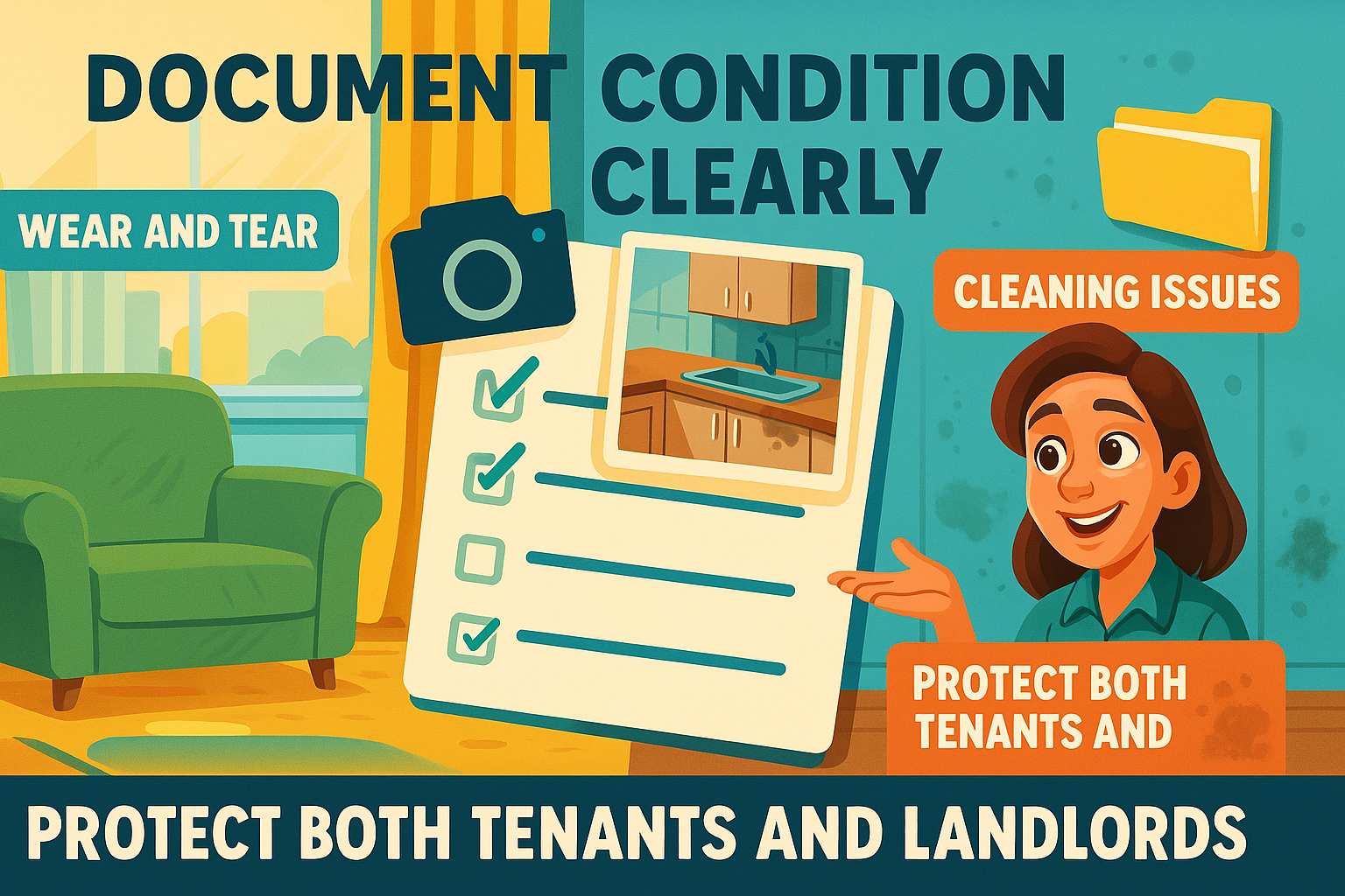 Take clear, dated photos of each room at move-in and move-out. Focus on areas prone to wear and tear, such as carpets, walls, and appliances, and capture any pre-existing damage, stains, or marks.