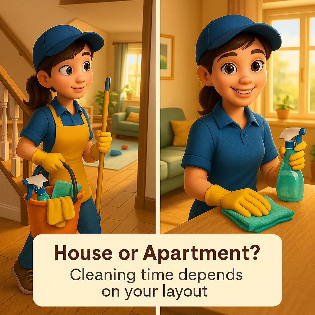 With fewer rooms to clean, apartments typically take less time. However, compact spaces like bathrooms and kitchens will still require thorough cleaning attention.