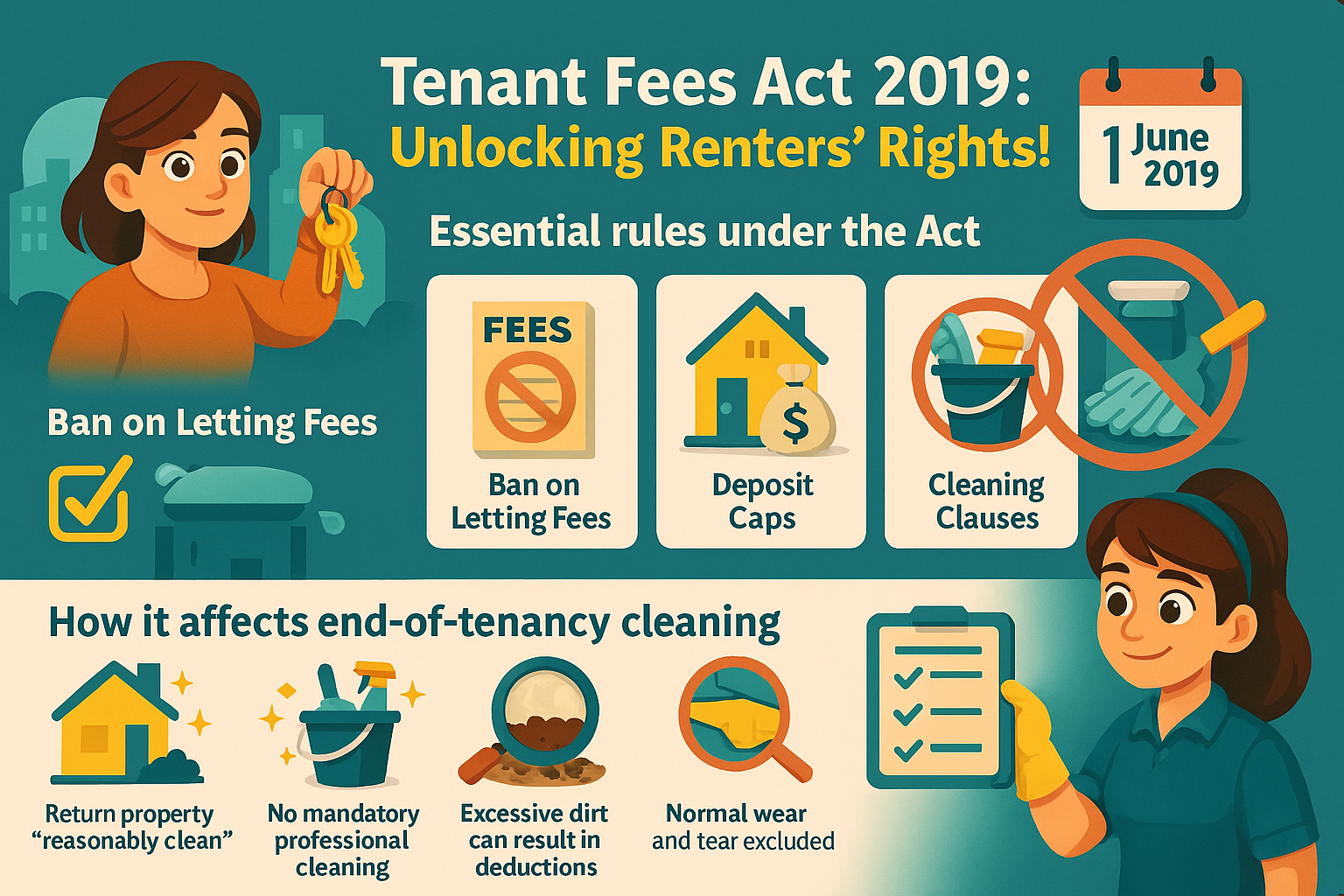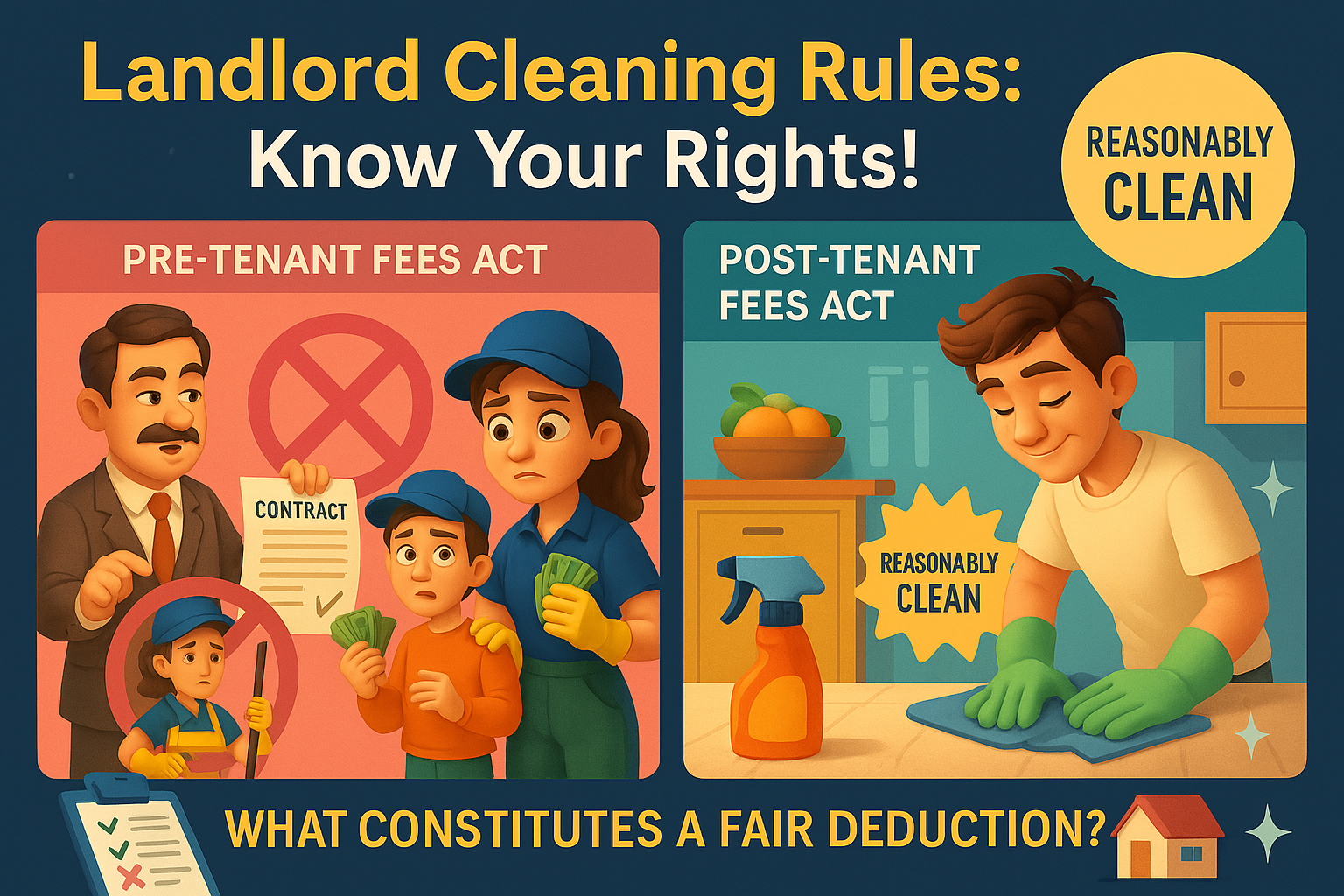 - The Tenant Fees Act 2019 bans mandatory professional cleaning clauses, instead requiring a "reasonably clean" standard.